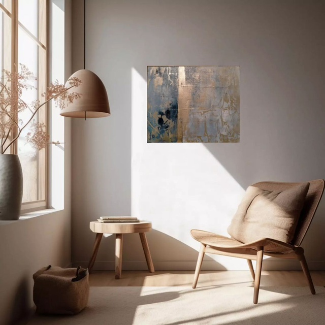 The artwork on canvas is a captivating blend of ethereal gold and blue tones, with intricate sections that create a mesmerizing effect. It is mixed media art that showcases creativity and movement